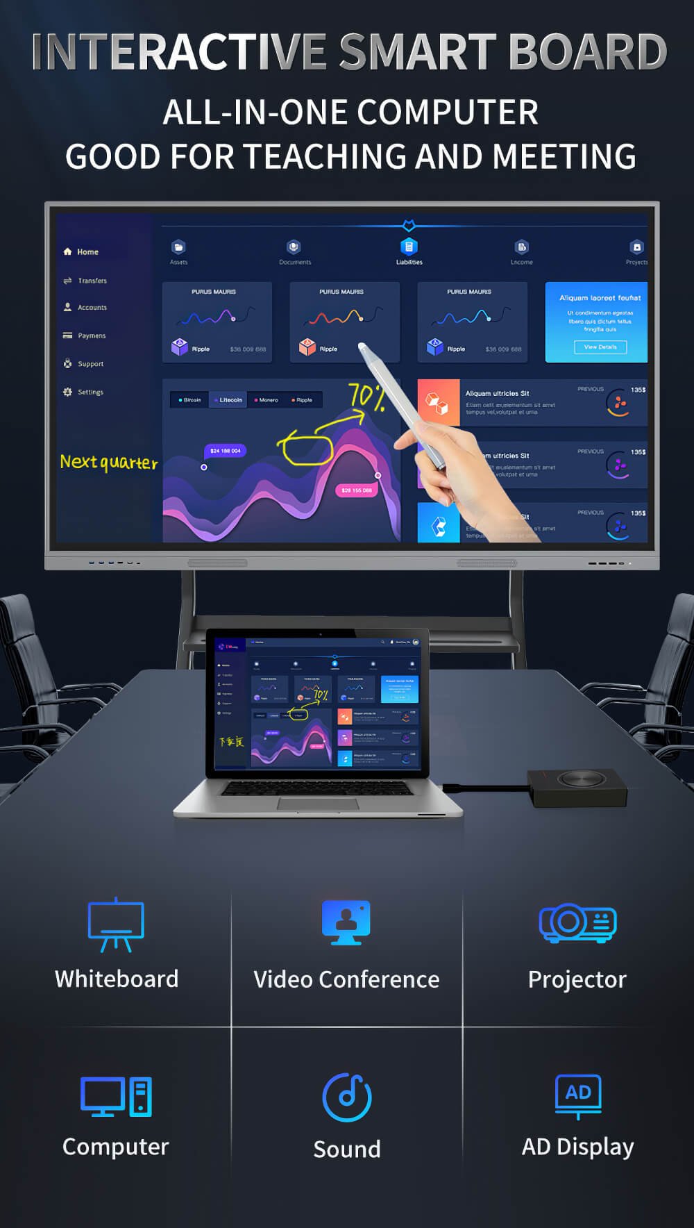 An interactive  flat Panel, commonly known as a smartboard, is an advanced display tool that operates interactively, either directly or through other devices, serving as a technological advancement over traditional whiteboards.