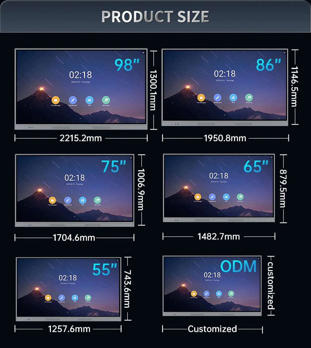 55 inches, 65 inches, 75 inches, 86 inches, 98 inches